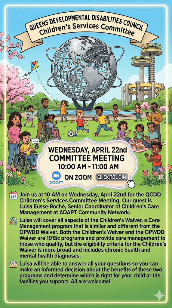The Queens Council on Developmental Disabilities is a group of professionals, parents, and advocates concerned about people with developmental disabilities living in Queens. The Council is authorized by Mental Hygiene Law to advise local and state government on service development and local priorities in regards to city and state resource allocations.
